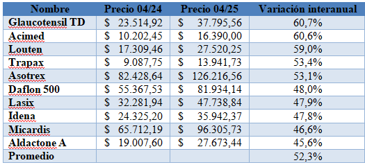 Asimismo, señalaron que en el último año, los diez medicamentos que más aumentaron su precio de venta al público lo hicieron un 52,3%, aunque también se encuentran aumentos interanuales por encima de dicho promedio, como el Glaucotensil TD con un aumento del 60,7% entre abril del 2024 y abril del 2025, Acimed con un aumento del 60,6% y Louten con un 59% de variación interanual.