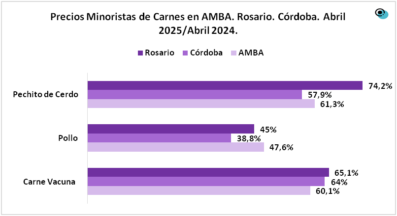 En las carnes de pollo, pechito de cerdo y carnes vacunas en las regiones de AMBA, Córdoba y Rosario se puede apreciar que en todas las carnes sufrieron fuertes aumentos, tal es así que en AMBA la vacuna subió 60,1%, en Córdoba 64% y en Rosario 65,1% en abril del 2025 comparándolo con el mismo mes del año anterior.
