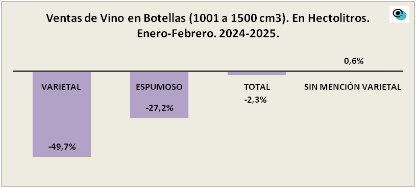 Por otro lado, en las ventas según el tipo de envase, el de botellas (1001 a 1500 centímetros cúbicos) tuvo un descenso del 2,3 en los dos primeros meses del 2025 en comparación con el mismo período del año anterior.