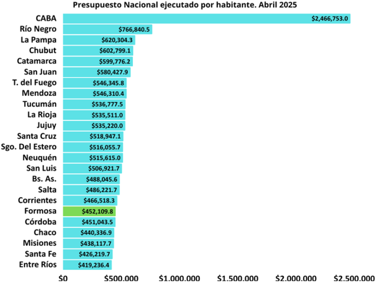 Desde la consultora Politiké explicaron que del análisis de los datos proporcionados por el presupuesto y la estimación poblacional del INDEC, se refleja una vez más que Formosa continúa el año 2025 ubicándose como una de las provincias que menos recursos nacionales recibió por habitante hasta abril de 2025. En contraste a esta situación, se puede observar cómo la Ciudad Autónoma de Buenos Aires (CABA) es la jurisdicción que más recursos recibe por habitante, reflejando la asimetría con el resto de las jurisdicciones.